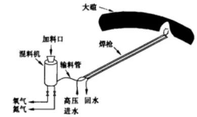 焊補(bǔ)設(shè)備主要由焊槍、混料機(jī)、操作控制盤、冷卻水加壓泵、高壓橡膠管組成。輔助設(shè)備有:均料機(jī)、耐材切割鋸、小型液壓站、冷卻設(shè)備等。工作條件要求:0.4MPa以上的純氧,0.02MPa的氮?dú)猓?MPa的水壓。焊補(bǔ)工作示意圖見圖1。