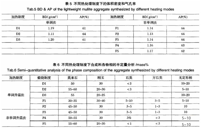 兩系列不同熱處理制度下輕質莫來石合成料的體積密度和顯氣孔率如表6所示。